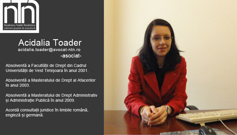 Cabinetele grupate de avocat Novăcescu-Toader-Novăcescu reprezintă o structură profesională rezultată din asocierea avocaţilor Lucia Novăcescu, Acidalia Toader şi Lucian Novăcescu, formând o echipă în care experienţa şi profesionalismul se îmbină cu dinamismul şi permanenta preocupare pentru protejarea intereselor clienţilor.